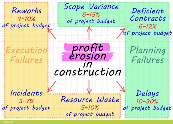 Global research shows that 70% of projects experience delays, creating a domino effect on operations. These delays lead to profit losses (10-30% of project budget) due to increased project duration. Furthermore, delays prevent constructors from handing over current projects and starting new ones, ultimately resulting in reduced market share. The most common root causes include scope variances, operational indiscipline, on-site incidents, slow approvals, supply chain disruption, and payment delays.