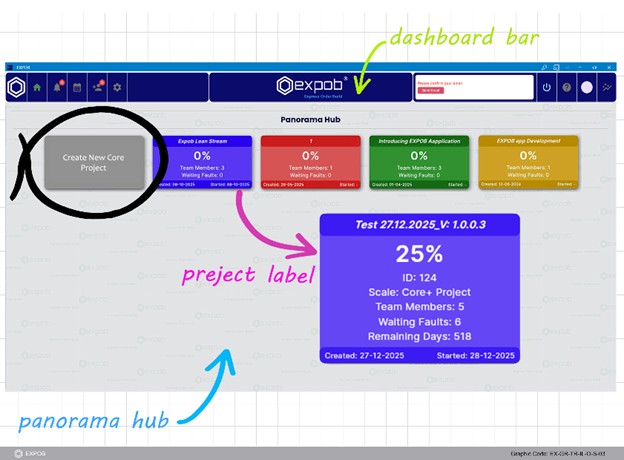 Upon signing in, you are directed to the EXPOB Home Page. To begin running a project, simply click "Create New Core Project" on the Panorama Hub. All projects you create, or those where other users have invited you to a role, will be located here.