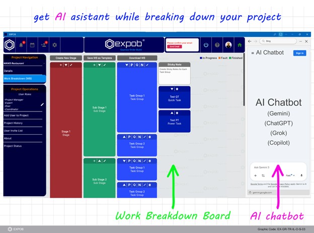 The Work Breakdown Board is the primary operational planning workspace of EXPOB. When you first create a project, the template you selected (Standard or HSE & Security included) generates a default Work Breakdown Structure (WBS) here.
