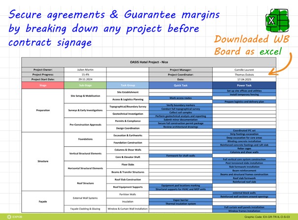 - Zero Risk with 360° Visibility: EXPOB enables preparing a detailed project program on the WB Board. This work breakdown is a vital attachment to your contracts with project owners, on which all Stages, Sub-Stages, Task Groups, and Tasks are defined in detail. Task IPPs serve as detailed references for what the sub-contractors should execute. By having this vital digital documentation, you can lower agreement risks toward zero.