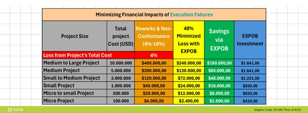 We selected the four most common issues with the highest financial impact on projects for this ROI calculation. To ensure a conservative and fair estimate, we have modeled EXPOB’s impact at a 40% improvement rate, though we expect more than 60% improvement if teams adopt EXPOB adequately. The losses presented in the table are estimated amounts based on research, defining the most prevalent financial drains when these issues occur in a project.