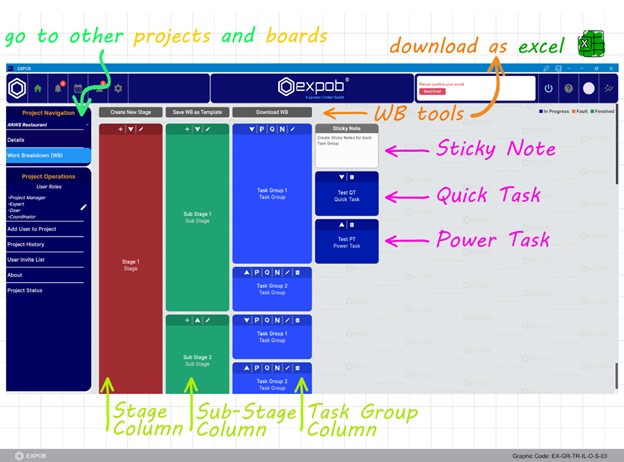 Figure 4- Dynamic WBS Management. The default Work Breakdown Structure (WBS) provided by EXPOB is fully customizable. Users can rearrange tasks to fit specific disciplines and export the entire board to Excel for external reporting.