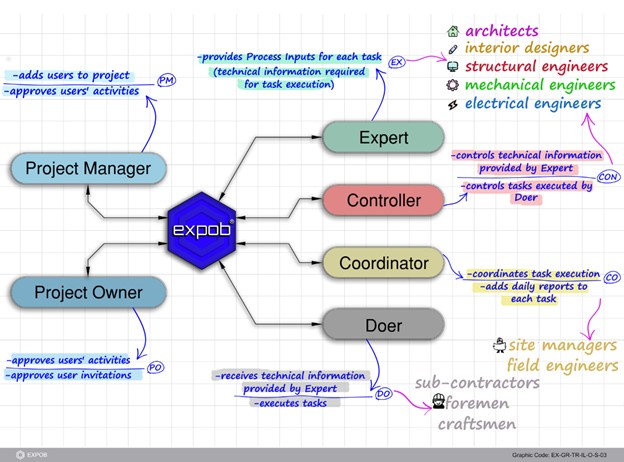 Figure 5- Role-Based Connection and Resource Optimization. EXPOB connects project participants by functional roles rather than individual identities. This modular structure allows a single user to hold multiple specialized roles within one project, ensuring that even a lean team can maintain high-standard, role-specific accountability and standardized workflows.