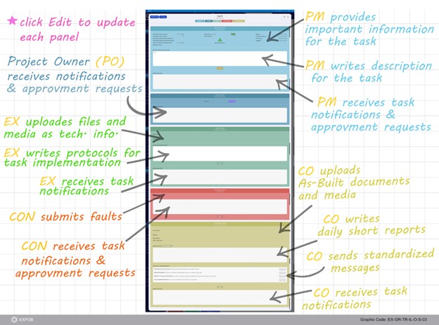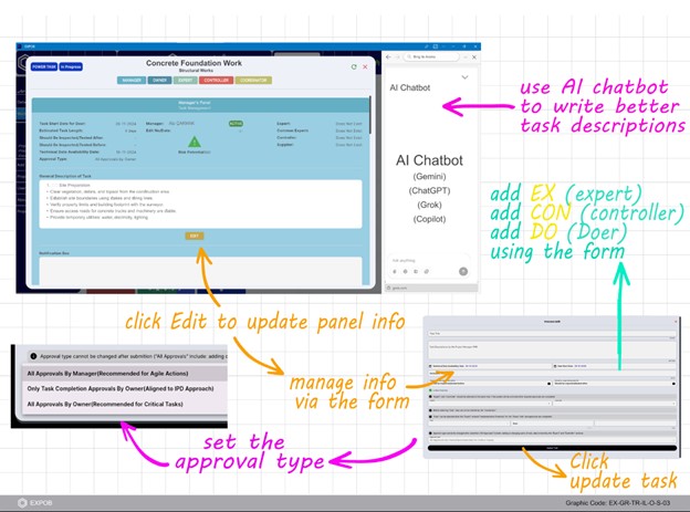 The progress of a task depends on the updates users make within the IPP. The Manager defines the general principles of task execution, while the Expert provides technical information to enable execution by the Coordinator and Doer. The Controller then verifies that the execution remains aligned with the Manager’s principles and the Expert’s technical specifications. Finally, the Project Owner provides the required task approvals directly within the IPP.