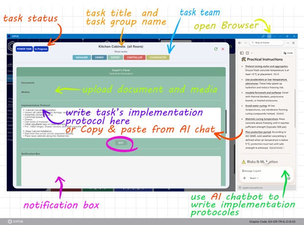 Figure 8- Technical Contributions. The Expert (EX) provides the technical foundation for execution, including CAD/BIM files, 3D models, and implementation protocols. AI chatbot is available to optimize these protocols.